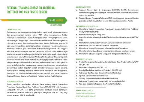 Tujuan pelatihan memberikan informasi dasar tentang Traktat Pencegahan h. Tata Cara Inspeksi Safeguards dan Protokol Tambahan.