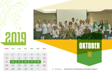 OKTOBER MINGGU SENIN SELASA RABU KAMIS JUMAT SABTU 10 29 30 1 2 3 4 5 6 7 8 9 10 11 12 13 14 15 16 17 18 19 20 21 22 23 24 25 26 27 28 29 30 31 1 2 14 - 18 Oktober PELATIHAN UJI KESESUAIAN PESAWAT SINAR-X