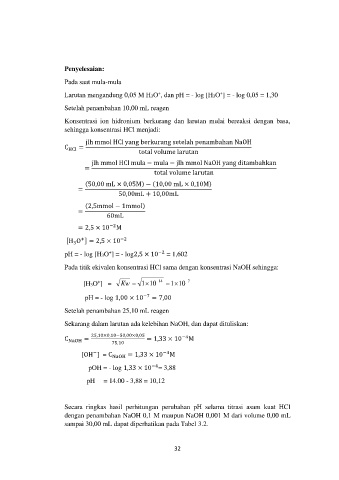 Larutan mengandung 0,05 M H3O , dan pH = - log [H3O ] = - log 0,05 = 1,30