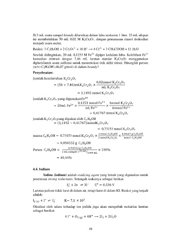 ini membutuhkan 50 mL 0,02 M K2Cr2O7, dengan pemanasan etanol dioksidasi