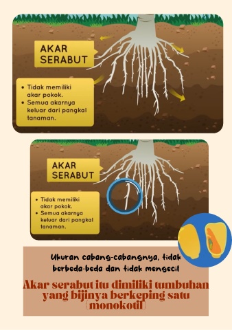 Ukuran cabang-cabangnya, tidak berbeda-beda dan tidak mengecil Akar serabut itu dimiliki tumbuhan yang bijinya berkeping satu (monokotil)