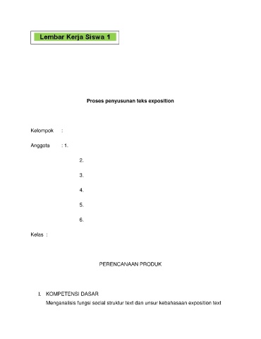 Proses penyusunan teks exposition Kelompok : Anggota : 1. 2. 3. 4. 5. 6. Kelas : PERENCANAAN PRODUK I. KOMPETENSI DASAR Menganalisis fungsi social struktur text dan unsur kebahasaan exposition text