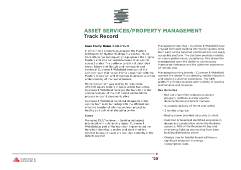 ASSET SERVICES/PROPERTY MANAGEMENT Track Record Case Study: Home Consortium In 2016, Home Consortium acquired the Masters holding entity, Hydrox Holdings Pty Limited. Home Consortium has subsequently re-purposed the original Masters sites into convenience based retail centres across 5 states. The portfolio consists of daily retail needs, leisure and lifestyle and homewares and electrical. Cushman & Wakefield were part of the advisory team that helped Home Consortium with the Masters acquisition and allowed us to develop a strong understanding of their requirements. Home Consortium was seeking to re-purpose 485,000 square meters of space across five states. Cushman & Wakefield managed the transition at the commencement of the DLP period and handover process across 18 geographic sites. Cushman & Wakefield mobilized all aspects of the centres from build to trading with the efficient and effective transfer of information from project to trading as a bulk retail shopping centre. Scope Managing DLP/handover – Building and assets presented with outstanding issues. Cushman & Wakefield as part of the transition implemented the transition checklist to review and audit modified services to ensure issues are captured correctly in the defects register. Managing remote sites – Cushman & Wakefield have created individual building information guides. Data from each centre becomes combined into one easily accessible platform. The platform provides visibility on centre performance, compliance. This allows the management team the ability to continuously improve performance and the customer experience of remote sites Managing incoming tenants - Cushman & Wakefield oversee the tenant fit out delivery, retailer induction and ongoing customer experience. The C&W platform provided retailers with visibility of reactive maintenance and response. Key Outcomes • • • • • • Roll out of portfolio-wide procurement program, portfolio and site specific documentation and tenant manuals Successful delivery of first 8 sites within 3 months of go live Buying power provided discounts to client Cushman & Wakefield identified anomalies in design and construction within the Retailers space i.e. 40% of the Retailers Hi Bay and emergency lighting was running from base building distribution board Change over to Retailer board will have a significant reduction in energy consumption costs. 120