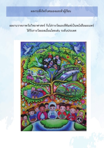 ผลงานที่เกิดกับตนเองและตัวผู้เรียน ผลงานวาดภาพวันวิทยาศาสตร์ รับโล่รางวัลและตีพิมพ์เป็นหนังสือเผยแพร่ ได้รับรางวัลยอดเยี่ยมโดดเด่น ระดับประเทศ เกียรติบัตรครู