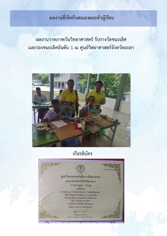 ผลงานที่เกิดกับตนเองและตัวผู้เรียน ผลงานวาดภาพวันวิทยาศาสตร์ รับรางวัลขนะเลิศ และรองชนะเลิศอันดับ 1 ณ ศูนย์วิทยาศาสตร์จังหวัดยะลา เกียรติบัตร