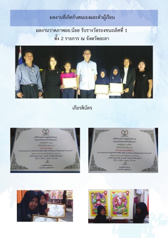 ผลงานที่เกิดกับตนเองและตัวผู้เรียน ผลงานวาดภาพอย.น้อย รับรางวัลรองชนะเลิศที่ 1 ทั้ง 2 รายการ ณ จังหวัดยะลา เกียรติบัตร