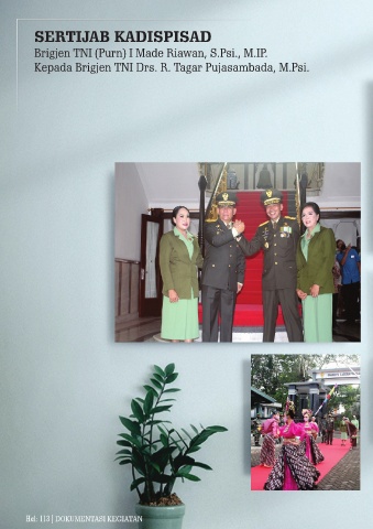 SERTIJAB KADISPISAD Brigjen TNI (Purn) I Made Riawan, S.Psi., M.IP. Kepada Brigjen TNI Drs. R. Tagar Pujasambada, M.Psi. Hal: 113| DOKUMENTASI KEGIATAN