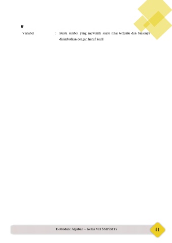 V Variabel : Suatu simbol yang mewakili suatu nilai tertentu dan biasanya disimbolkan dengan huruf kecil E-Module Aljabar – Kelas VII SMP/MTs 41