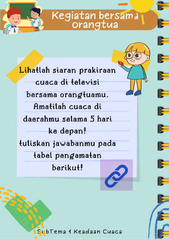 Kegiatan bersama orangtua Lihatlah siaran prakiraan cuaca di televisi bersama orangtuamu. Amatilah cuaca di daerahmu selama 5 hari ke depan! tuliskan jawabanmu pada tabel pengamatan berikut! SubTema 1 Keadaan Cuaca