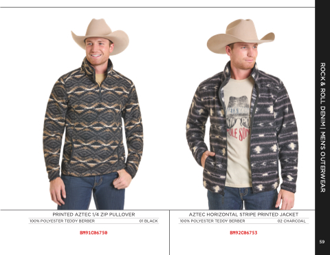 PRINTED AZTEC 1/4 ZIP PULLOVER 100% POLYESTER TEDDY BERBER BM91C06750 AZTEC HORIZONTAL STRIPE PRINTED JACKET 01 BLACK 100% POLYESTER TEDDY BERBER 02 CHARCOAL BM92C06753 ROCK & ROLL DENIM | MEN’S OUTERWEAR 59