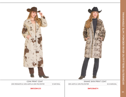 COW PRINT COAT SNAKE SKIN PRINT COAT 40% MODACRYLIC 40% ACRYLIC 20% POLYESTER 12 NATURAL 80% ACRYLIC 20% POLYESTER DW92C04155 DW92C06874 02 CHARCOAL PANHANDLE SLIM | POWDER RIVER OUTFITTERS OUTERWEAR 65