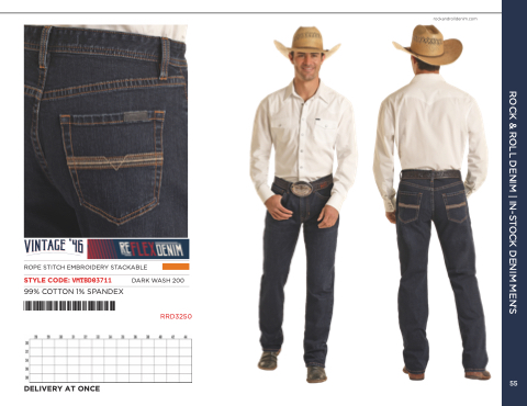 rockandrolldenim.com ROPE STITCH EMBROIDERY STACKABLE STYLE CODE: VMTBD03711 DARK WASH 200 99% COTTON 1% SPANDEX *VMTBD03711* RRD3250 DELIVERY AT ONCE ROCK & ROLL DENIM | IN-STOCK DENIM MEN’S 55