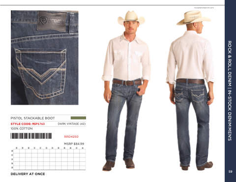 PISTOL STACKABLE BOOT STYLE CODE: MSP1763 100% COTTON *MSP1763* DELIVERY AT ONCE rockandrolldenim.com DARK VINTAGE (42) RRD4250 MSRP $84.99 ROCK & ROLL DENIM | IN-STOCK DENIM MEN’S 59