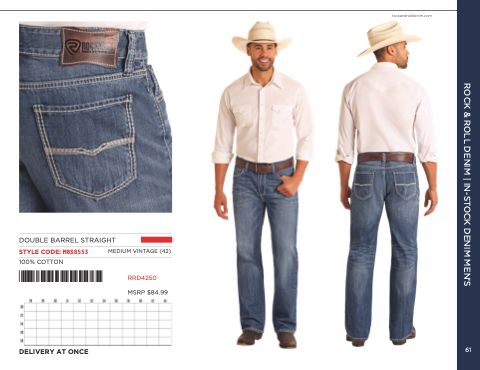 rockandrolldenim.com DOUBLE BARREL STRAIGHT STYLE CODE: M0S8553 MEDIUM VINTAGE (42) 100% COTTON *M0S8553* RRD4250 MSRP $84.99 DELIVERY AT ONCE ROCK & ROLL DENIM | IN-STOCK DENIM MEN’S 61
