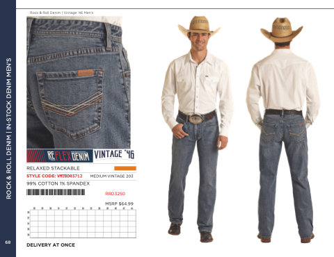 Rock & Roll Denim | Vintage ‘46 Men’s ROCK & ROLL DENIM | IN-STOCK DENIM MEN’S RELAXED STACKABLE STYLE CODE: VMTBD03712 MEDIUM VINTAGE 203 99% COTTON 1% SPANDEX * VMTBD03712 * RRD3250 MSRP $64.99 68 DELIVERY AT ONCE