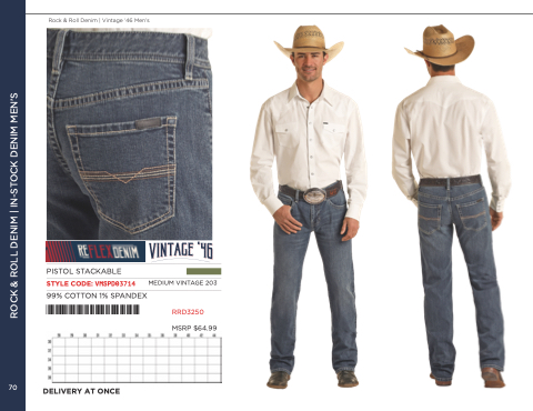 Rock & Roll Denim | Vintage ‘46 Men’s ROCK & ROLL DENIM | IN-STOCK DENIM MEN’S PISTOL STACKABLE STYLE CODE: VMSPD03714 MEDIUM VINTAGE 203 99% COTTON 1% SPANDEX * VMSPD03714 * RRD3250 MSRP $64.99 70 DELIVERY AT ONCE