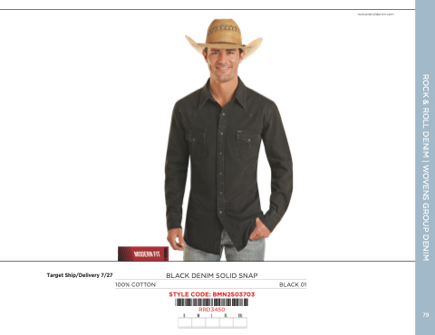 rockandrolldenim.com ROCK & ROLL DENIM | WOVENS GROUP DENIM Target Ship/Delivery 7/27 BLACK DENIM SOLID SNAP 100 % COTTON BLACK 01 STYLE CODE: BMN2S03703 * BMN2S03703 * RRD3450 79