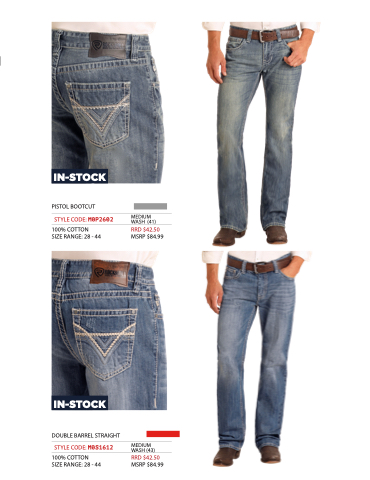 IN-STOCK PISTOL BOOTCUT STYLE CODE: M0P2602 MEDIUM WASH (41) 100% COTTON SIZE RANGE: 28 - 44 RRD $42.50 MSRP $84.99 IN-STOCK DOUBLE BARREL STRAIGHT STYLE CODE: M0S1612 MEDIUM WASH (43) 100% COTTON SIZE RANGE: 28 - 44 RRD $42.50 MSRP $84.99