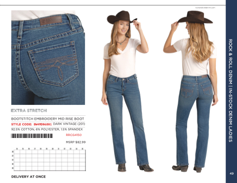 rockandrolldenim.com BOOTSTITCH EMBROIDERY MID RISE BOOT STYLE CODE: BW4MD06801 DARK VINTAGE (201) 92.5% COTTON, 6% POLYESTER, 1.5% SPANDEX *BW4MD06801* RRCG4150 MSRP $82.99 DELIVERY AT ONCE ROCK & ROLL DENIM | IN-STOCK DENIM LADIES 49