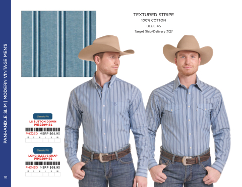 PANHANDLE SLIM | MODERN VINTAGE MEN’S 10 LS BUTTON DOWN PMB2S09481 * PMB2S09481 * PH3250 MSRP $64.95 LONG SLEEVE SNAP PMN2S09481 * PMN2S09481 * PH3450 MSRP $68.95 TEXTURED STRIPE 100% COTTON BLUE 45 Target Ship/Delivery 7/27