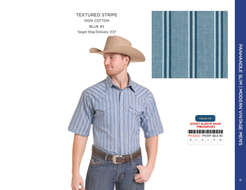 TEXTURED STRIPE 100% COTTON BLUE 45 Target Ship/Delivery 7/27 SHORT SLEEVE SNAP PMN3S09481 * PMN3S09481 * PH3250 MSRP $64.95 PANHANDLE SLIM | MODERN VINTAGE MEN’S 11