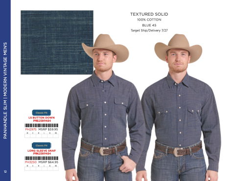 PANHANDLE SLIM | MODERN VINTAGE MEN’S 12 LS BUTTON DOWN PMB2S09484 * PMB2S09484 * PH2975 MSRP $59.95 LONG SLEEVE SNAP PMN2S09484 * PMN2S09484 * PH3250 MSRP $64.95 TEXTURED SOLID 100% COTTON BLUE 45 Target Ship/Delivery 7/27