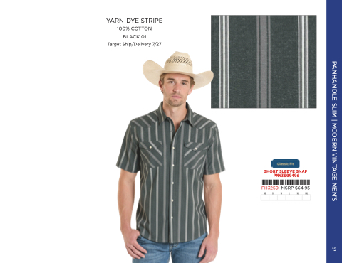 YARN-DYE STRIPE 100% COTTON BLACK 01 Target Ship/Delivery 7/27 SHORT SLEEVE SNAP PMN3S09496 * PMN3S09496 * PH3250 MSRP $64.95 PANHANDLE SLIM | MODERN VINTAGE MEN’S 15