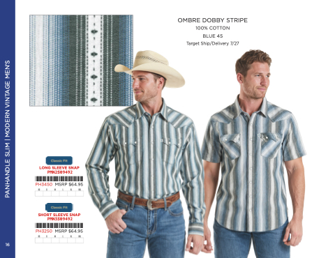 PANHANDLE SLIM | MODERN VINTAGE MEN’S 16 OMBRE DOBBY STRIPE 100% COTTON BLUE 45 Target Ship/Delivery 7/27 LONG SLEEVE SNAP PMN2S09492 * PMN2S09492 * PH3450 MSRP $64.95 SHORT SLEEVE SNAP PMN3S09492 * PMN3S09492 * PH3250 MSRP $64.95