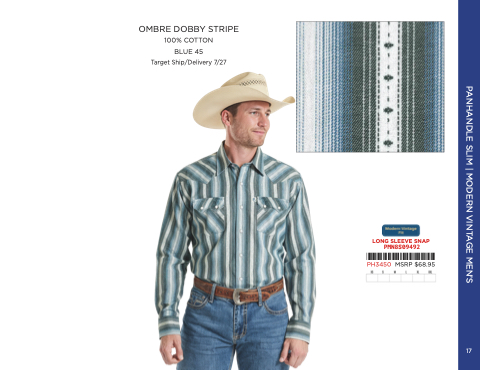 OMBRE DOBBY STRIPE 100% COTTON BLUE 45 Target Ship/Delivery 7/27 LONG SLEEVE SNAP PMN8S09492 * PMN8S09492 * PH3450 MSRP $68.95 PANHANDLE SLIM | MODERN VINTAGE MEN’S 17