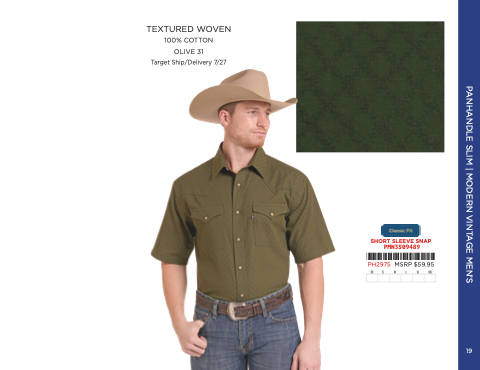 TEXTURED WOVEN 100% COTTON OLIVE 31 Target Ship/Delivery 7/27 SHORT SLEEVE SNAP PMN3S09489 * PMN3S09489 * PH2975 MSRP $59.95 PANHANDLE SLIM | MODERN VINTAGE MEN’S 19