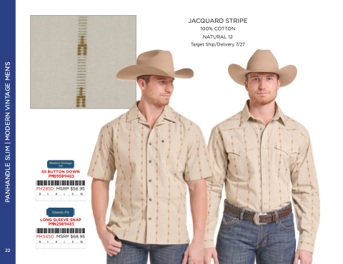 PANHANDLE SLIM | MODERN VINTAGE MEN’S 22 SS BUTTON DOWN PMB9S09485 * PMB9S09485 * PH2850 MSRP $56.95 LONG SLEEVE SNAP PMN2S09485 * PMN2S09485 * PH3450 MSRP $68.95 JACQUARD STRIPE 100% COTTON NATURAL 12 Target Ship/Delivery 7/27