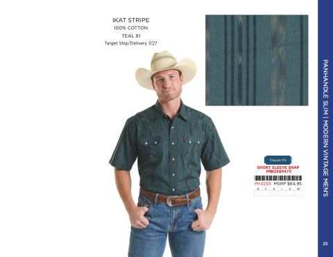 IKAT STRIPE 100% COTTON TEAL 81 Target Ship/Delivery 7/27 SHORT SLEEVE SNAP PMN3S09479 * PMN3S09479 * PH3250 MSRP $64.95 PANHANDLE SLIM | MODERN VINTAGE MEN’S 25