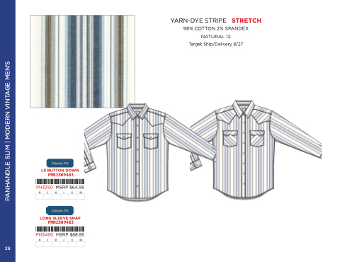 PANHANDLE SLIM | MODERN VINTAGE MEN’S 28 YARN-DYE STRIPE STRETCH 98% COTTON 2% SPANDEX NATURAL 12 Target Ship/Delivery 8/27 LS BUTTON DOWN PMB2S09483 * PMB2S09483 * PH3250 MSRP $64.95 LONG SLEEVE SNAP PMN2S09483 * PMN2S09483 * PH3450 MSRP $68.95