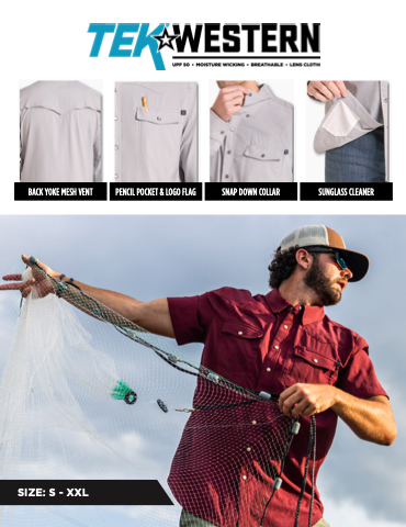 BACK YOKE MESH VENT PENCIL POCKET & LOGO FLAG SNAP DOWN COLLAR SUNGLASS CLEANER SIZE: S - XXL