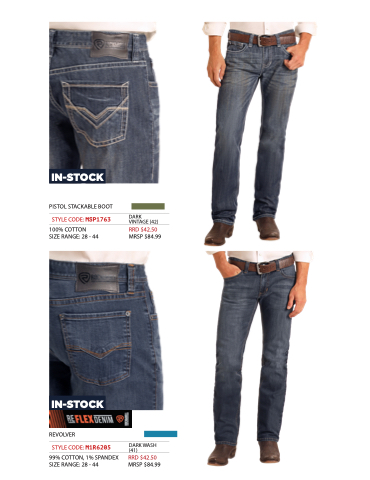 IN-STOCK PISTOL STACKABLE BOOT STYLE CODE: MSP1763 DARK VINTAGE (42) 100% COTTON SIZE RANGE: 28 - 44 RRD $42.50 MRSP $84.99 IN-STOCK REVOLVER 99% COTTON, 1% SPANDEX SIZE RANGE: 28 - 44 STYLE CODE: M1R6205 DARK WASH (41) RRD $42.50 MRSP $84.99