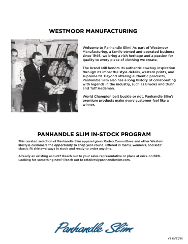 This curated selection of Panhandle Slim apparel gives Rodeo Committees and other Western