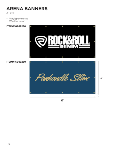 ARENA BANNERS 3’ x 6’ • • Vinyl grommeted Weatherproof ITEM# 16A02250 ITEM# 16B02250 3’ 6’ 12