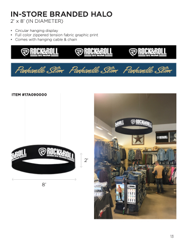 IN-STORE BRANDED HALO 2’ x 8’ (IN DIAMETER) • • • Circular hanging display Full color zippered tension fabric graphic print Comes with hanging cable & chain ITEM #17A090000 2’ 8’ 13