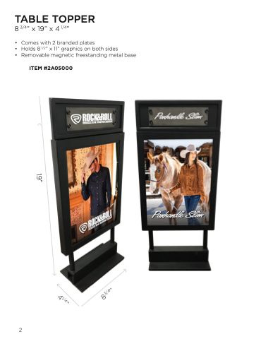 TABLE TOPPER 8 3/4” x 19” x 4 1/4” • • • Comes with 2 branded plates Holds 8 1/2” x 11” graphics on both sides Removable magnetic freestanding metal base ITEM #2A05000 19” 83/4” 41/4” 2
