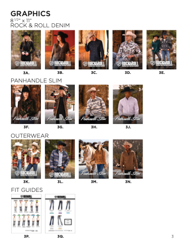 GRAPHICS 8 1/2” x 11” ROCK & ROLL DENIM 3A. PANHANDLE SLIM 3C. 3B. 3D. 3E. 3F. OUTERWEAR 3G. 3H. 3J. 3K. FIT GUIDES 3L. 3M. 3N. 3P. 3Q. 3