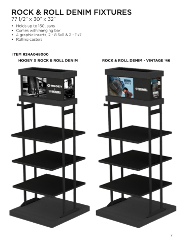 ROCK & ROLL DENIM FIXTURES 77 1/2” x 30” x 32” • • • • Holds up to 160 jeans Comes with hanging bar 4 graphic inserts; 2 - 8.5x11 & 2 - 11x7 Rolling casters ITEM #24A048000 HOOEY X ROCK & ROLL DENIM ROCK & ROLL DENIM - VINTAGE ‘46 7
