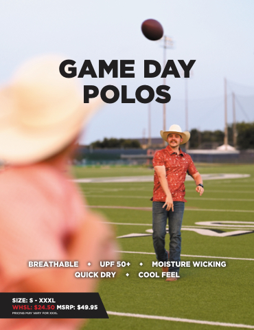 GAME DAY POLOS SIZE: S - XXXL WHSL: $24.50 MSRP: $49.95 PRICING MAY VARY FOR XXXL