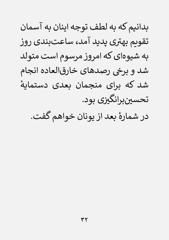 نامسآ هب نانیا هجوت فطل هب هک مینادب ی زور یدنب تعاس ،دمآ دیدپ ینهب میوقت دلوتم تسا موسرم زورما هک یا هویش هب ماجنا هداعلا قراخ یاهدصر حیرب و دش ٔ هیامتسد یدعب نامجنم یارب هک دش دوب ینگنارب . یسحت ٔ . تفگ مهاوخ نانوی زا دعب هرامش رد 32