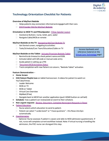 TechnologyOrientationChecklistforPatientsOverviewofMyChartBedside Helpspatientsstayconnected,informedandengagedwiththeircare. EHHProviderFAQforMyChartBedsideOrientationtoMCBTVandPillowSpeaker:PillowSpeakerLayout AssistanceButtons-nurse,toilet,pain,water NavigateCable/MCBonremoteMyChartBedsideontheTV:NavigatingMyChartBedsideTV GetStartedscreen,navigatingtoactivities: Tasks/Schedule/CareTeam/Education/CableonTVMyChartBedsideontheTablet:Activate/ProvisionBedsideTablet RemindtodotimeouttocheckpatientnameandDOB. ActivatetabletwithQRcodeormanualcode-entry Guidepatientin setting upaPIN DocumentMCBActivationStatus TrackcompletionwithnewPatientListcolumn,%u201cBedsideTablet%u201dactivation.FeatureDemonstration%u2013%u2022HomeScreen%u2022EHHPatientPlaylistIconontablethomescreen:4videosforpatienttowatchon YouTube/Vimeo. LeaderWelcome MCBonTV MCBonTablet VirtualCareOverview MyMeal(iflive) NavigatebacktoMCBfromanotherapplication(pushHOMEbuttononcallbell)%u2022Schedule-howapatientcanreview/addaneventtotheirschedule.%u2022Non-urgentrequests:Review,Document,CompleteNonUrgentRequestsinRover%u2022PatientEducation Nurseselectswhicheducationtosendtopatient. Patientcanselect%u201cIunderstand%u201dor%u201cIhavequestions%u201d%u2013thisflowsintoEpic automatically.%u2022Questionnaires Optional:NurseassessesifpatientisawareandabletoMCBadmissionquestionnaire.If not,nursewillcompletecurrentworkflowinstead.Note:Ifvirtualnursingishandlingthe admission, the POC nurse can disregard this step.Accesstipsheetsand reference material onthe Virtual Care Technologypage!