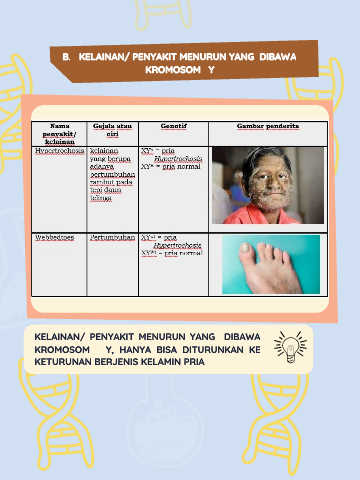 B. KELAINAN/ PENYAKIT MENURUN YANG DIBAWA KROMOSOM Y KELAINAN/ PENYAKIT MENURUN YANG DIBAWA KROMOSOM Y, HANYA BISA DITURUNKAN KE KETURUNAN BERJENIS KELAMIN PRIA