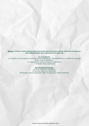 ✘Gratuities, personal expenses, drinks during meals unless mentioned