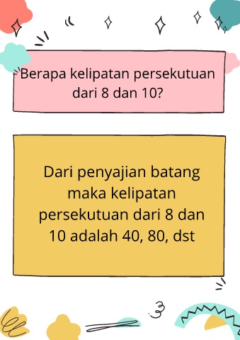 Berapa kelipatan persekutuan dari 8 dan 10? Dari penyajian batang maka kelipatan persekutuan dari 8 dan 10 adalah 40, 80, dst