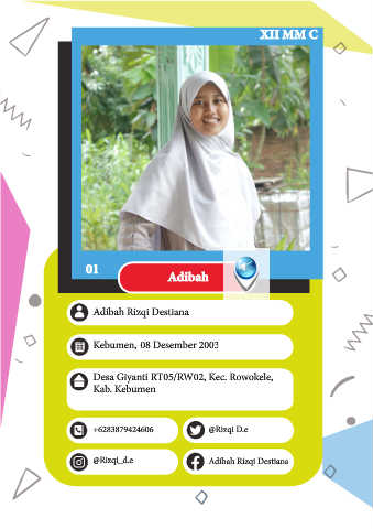 XII MM C 01 Adibah Adibah Rizqi Destiana Kebumen, 08 Desember 2003 Desa Giyanti RT05/RW02, Kec. Rowokele, Kab. Kebumen +6283879424606 @Rizqi D.e @Rizqi_d.e Adibah Rizqi Destiana