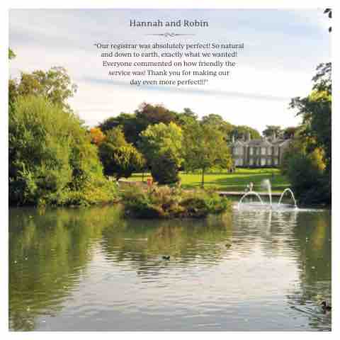 Hannah and Robin “Our registrar was absolutely perfect! So natural and down to earth, exactly what we wanted! Everyone commented on how friendly the service was! Thank you for making our day even more perfect!!!”
