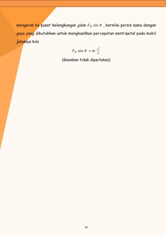 mengarah ke pusat kelengkungan jalan , bernilai persis sama dengan gaya yang dibutuhkan untuk menghasilkan percepatan sentripetal pada mobil jelasnya bila 2 = (Gesekan tidak diperlukan) 35
